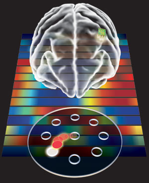 The research at CNEP builds on earlier work, including a 2009 UC Berkeley study showing that the macaque monkey’s brain is capable of forming a motor memory to control a disembodied device. Signals from the brain’s motor cortex were translated by a “decoder,” analogous to a simplified spinal cord, into deliberate movements of a computer cursor. The task involved moving a cursor from a central starting point out to a nearby target. (John Blanchard illustration)